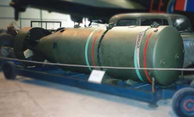 enormen Abmessungen (Länge: 7,70 Meter, Durchmesser: 1,17 Meter) konnten sie nur von umgebauten Avro Lancaster-Bombern getragen werden (Lancaster