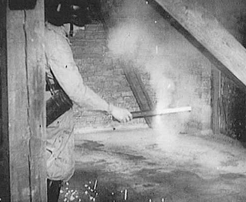 eine englische Stabbrandbombe wog nur ca. 1,7 kg (4 lbs.) wurden meist nur Dachgeschosse durchschlagen, wo der Brandsatz dann etwa